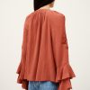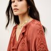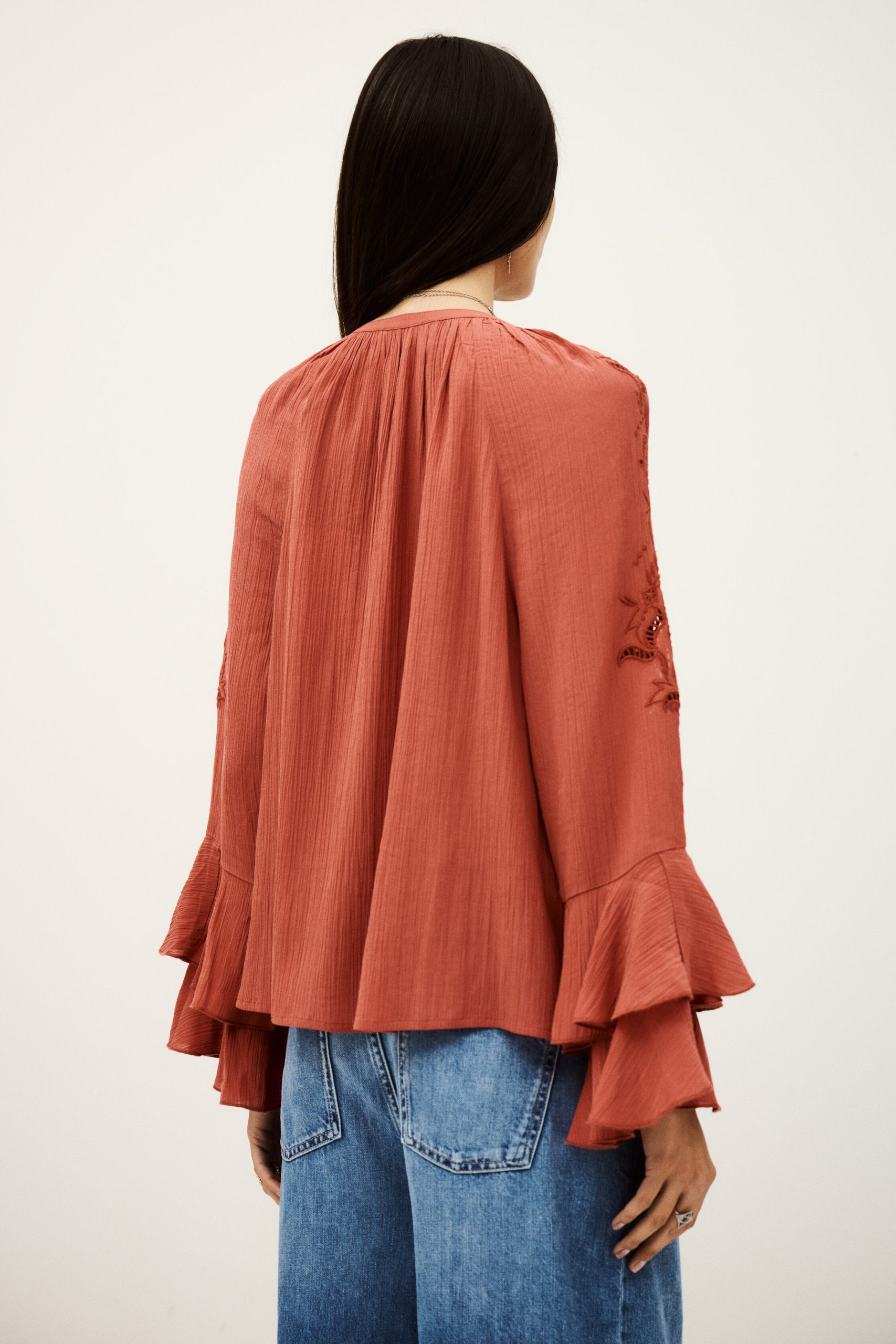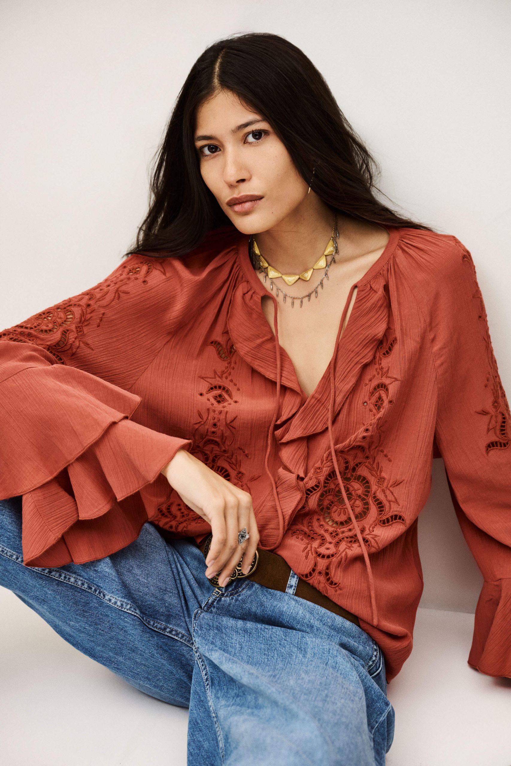 – Loose-fitting- Long sleeves- Frilly details- V-neckline- String ties- English embroideryThe viscose in this model is made from wood pulp from sustainably managed forests.