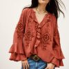 – Loose-fitting- Long sleeves- Frilly details- V-neckline- String ties- English embroideryThe viscose in this model is made from wood pulp from sustainably managed forests.