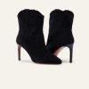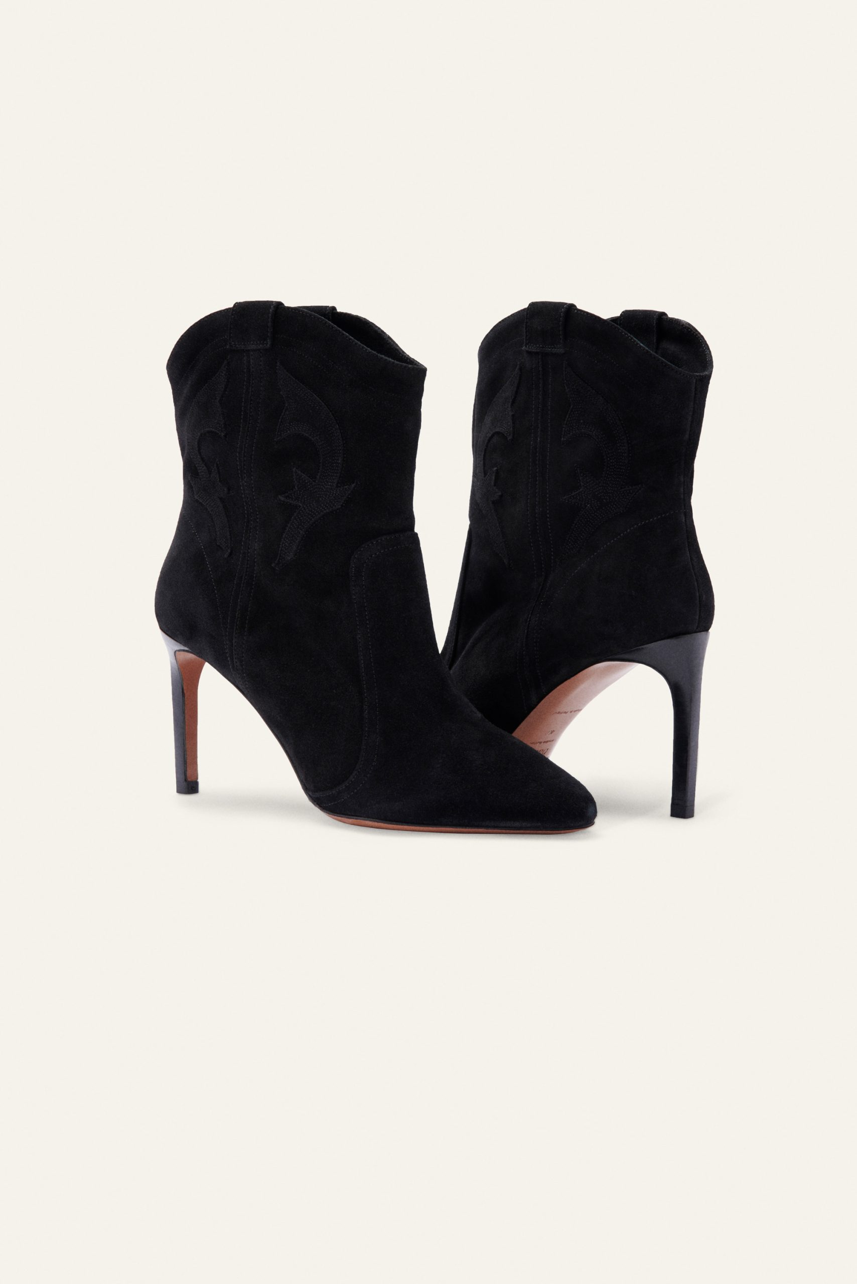 These heeled ba&sh ankle boots combine glamourous styling with American influences for an ultra-trendy look. Their pointy toe and stiletto heel flatter the figure while the cut out motifs and topstitching bring lots of originality. You’ll highlight these cowboy-inspired low boots wearing them with 7/8 length jeans or a skirt. – Suede ankle boots- High heel : 85 mm- Pointy toe- Matching topstitching- 100% suede