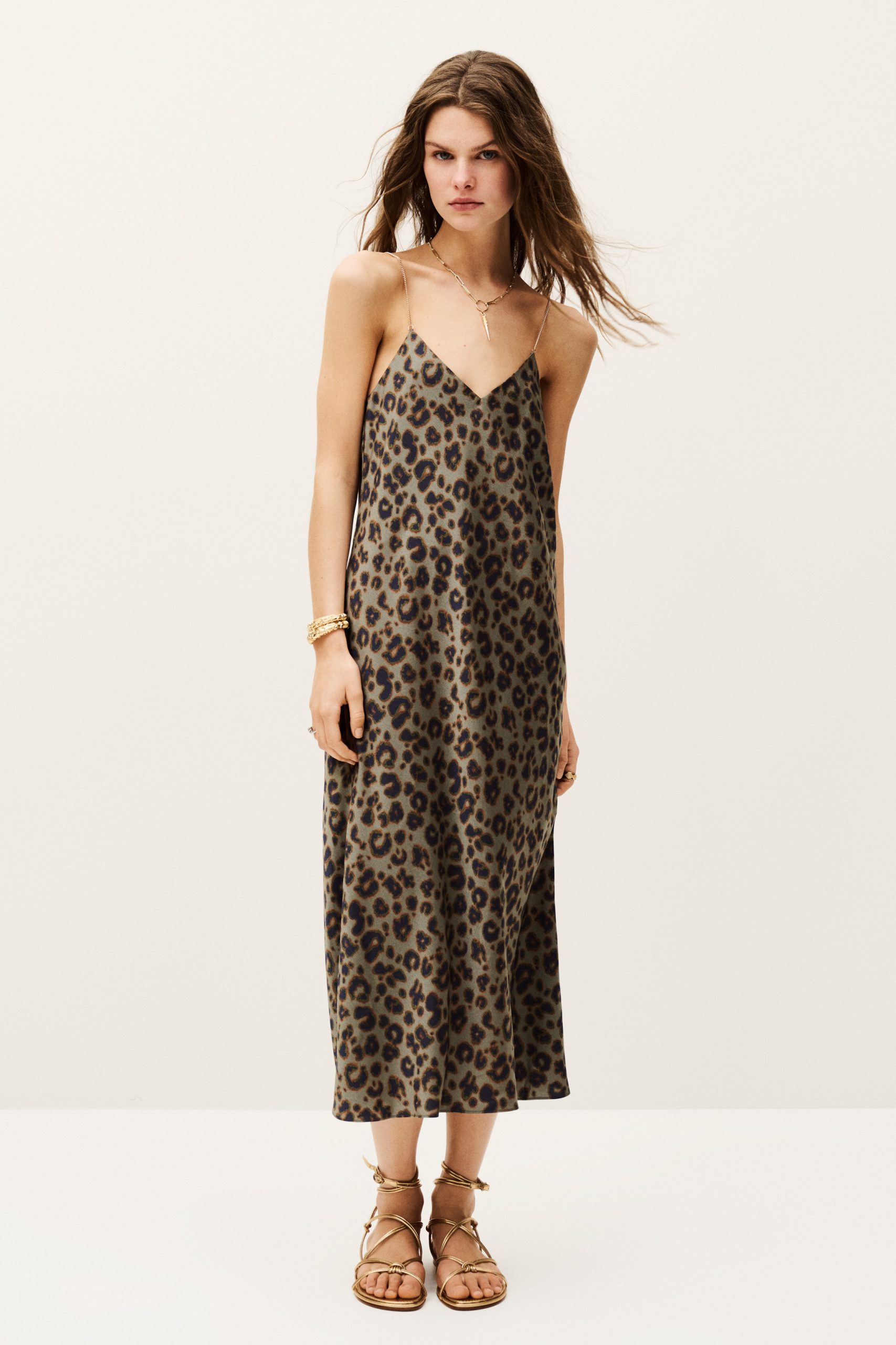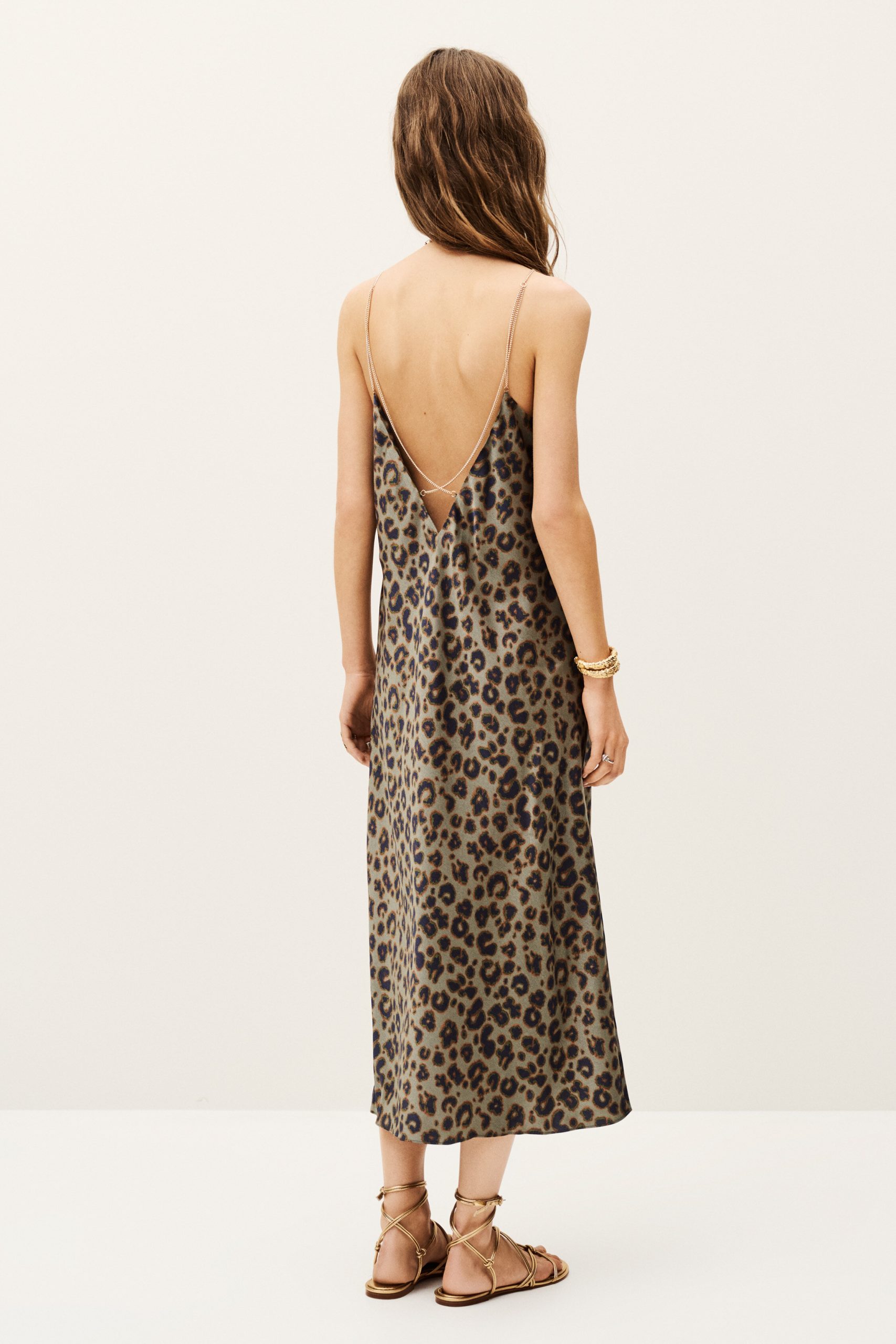 – Midi length- Flowing fabric- Snug-fitting- Chain straps crossed in the back- V-neckline in back- Satin look- This item is made with organic cotton