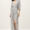 – Maxi length- Flared- Plunging V-neckline- Short and loose-fitting kimono style sleeves- Fitted waist- Gathered front and backThis model contains recycled synthetic fibers.