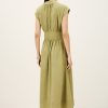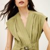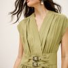 – Midi length- Wrap style- Short sleeves- Pleated style shoulders- Large belt with two metal bucklesThis model contains recycled synthetic fibers.