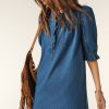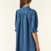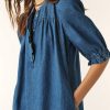 – Short length- Loose fit- Short elasticated sleeves- Frilly detail at the neckline- Snap button closure- Soft denim fabric
