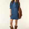 – Short length- Loose fit- Short elasticated sleeves- Frilly detail at the neckline- Snap button closure- Soft denim fabric