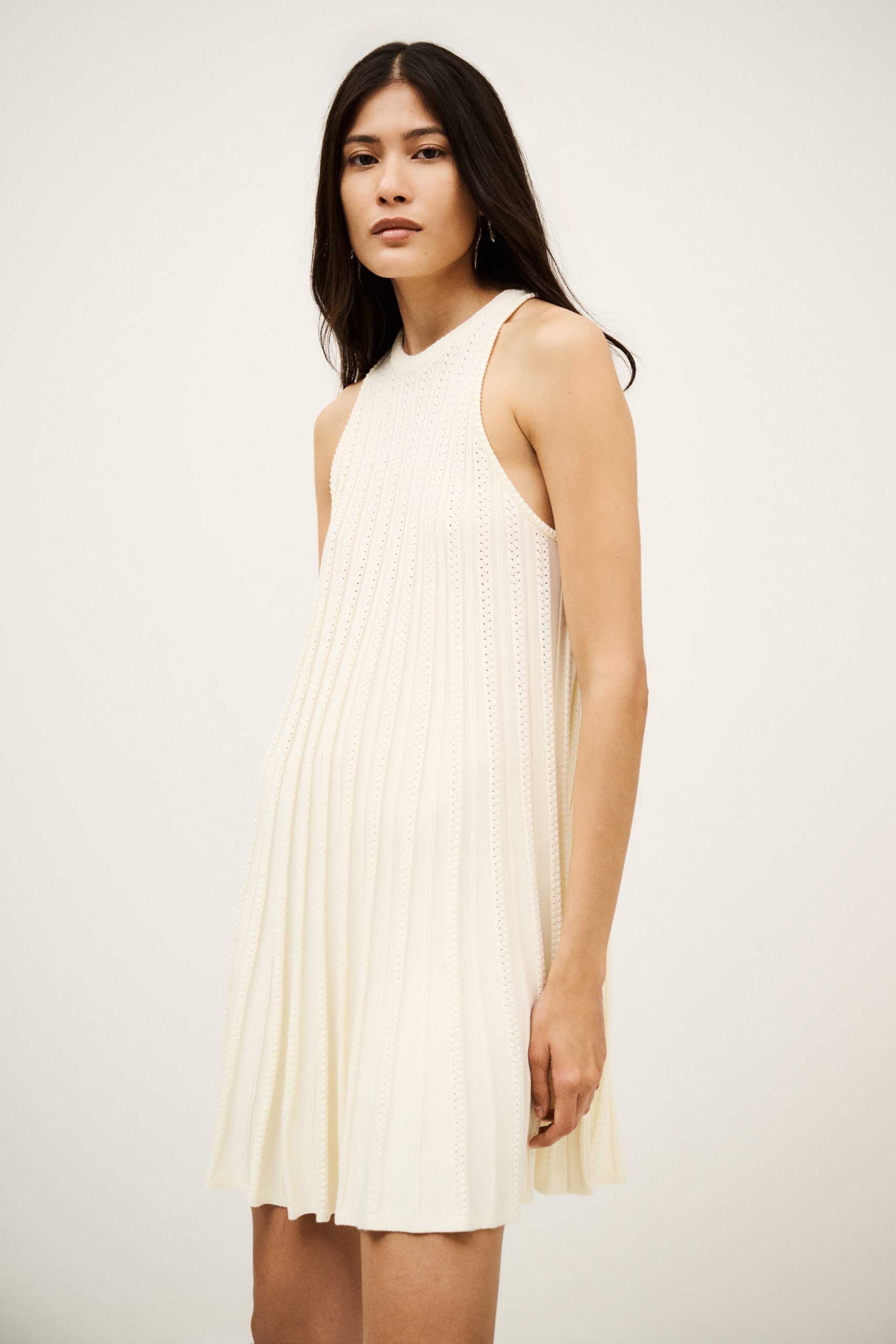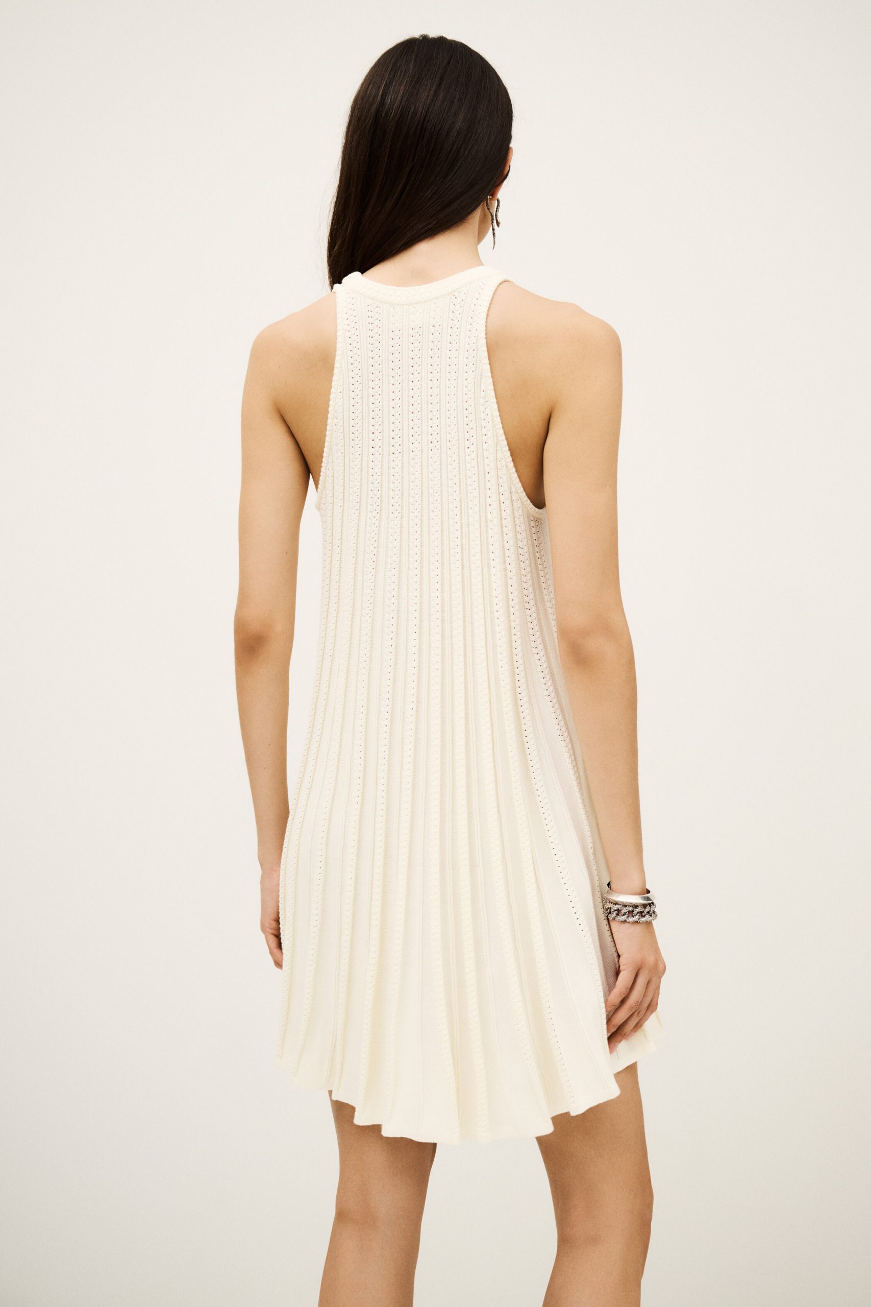 – Sleeveless- Knit- Racerback- Trapezoid cut- Textured sunray style knit: jersey, moss stitch, pointelle knit