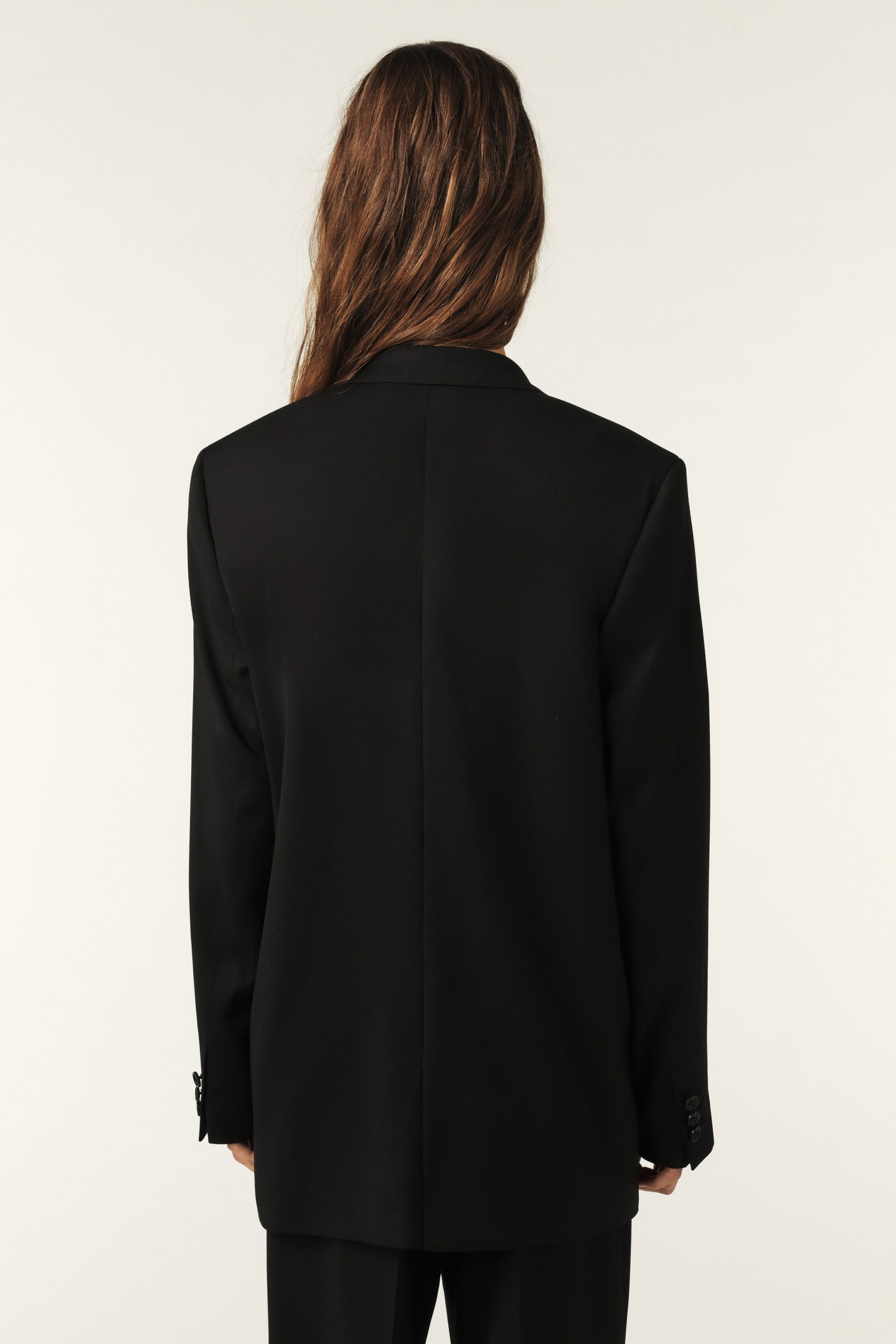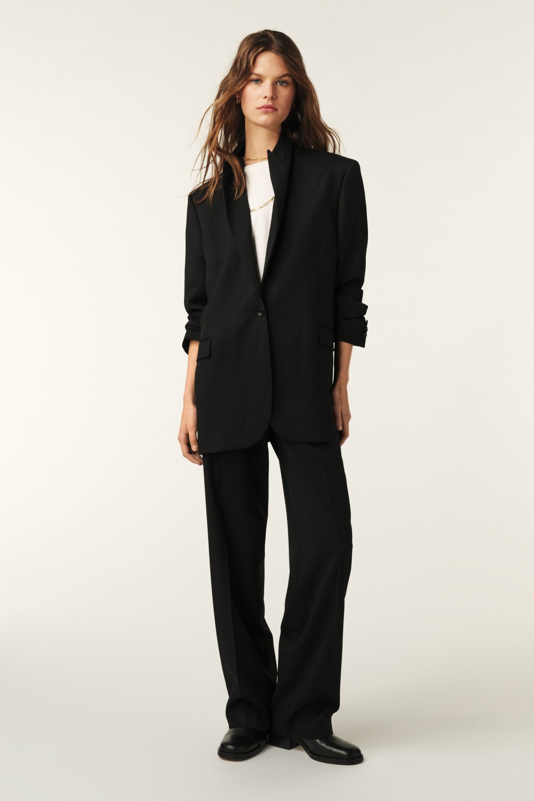 – Tailored- Lapel collar- Buttoned closure- Slit at the bottom of the sleeve- Slit back- Flap pockets- Inner pocket