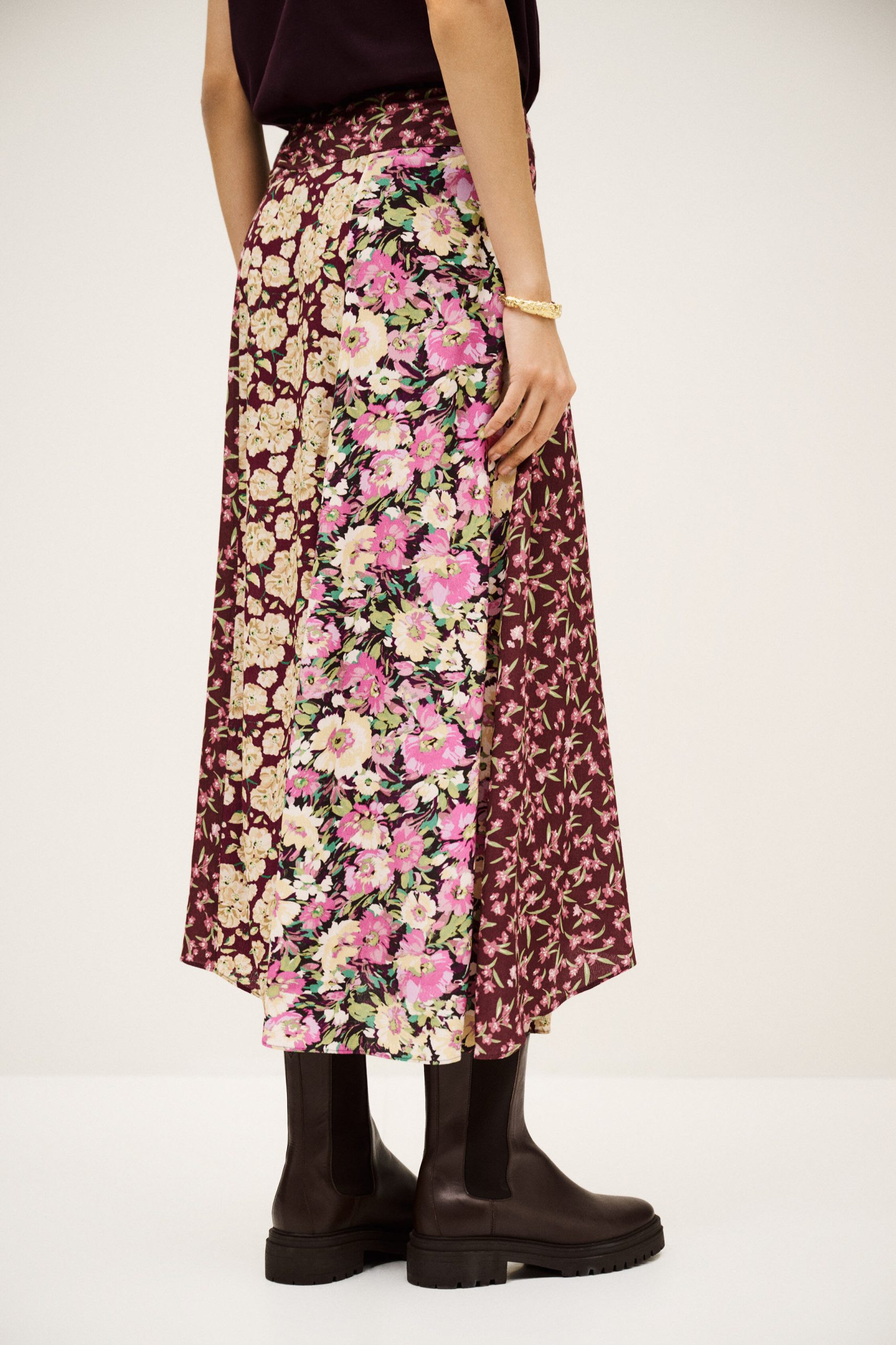 – Asymmetrical cut- Mix of prints- Hip yoke- Flared base- Gathered godets- Zip-up sideThis model contains LENZING™ ECOVERO™ viscose, a fiber made from wood pulp from sustainably managed forests. LENZING™ and ECOVERO™ are trademarks of Lenzing AG.The viscose in this model is made from wood pulp from sustainably managed forests.