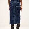 – Midi column cut- High waist- Double metal buttons at waist- Rounded front and patch back pockets- Slit for easy movement- Engraved metal hook detail at waistband- Striped denimThe cotton fibers in this model come from organic farming.