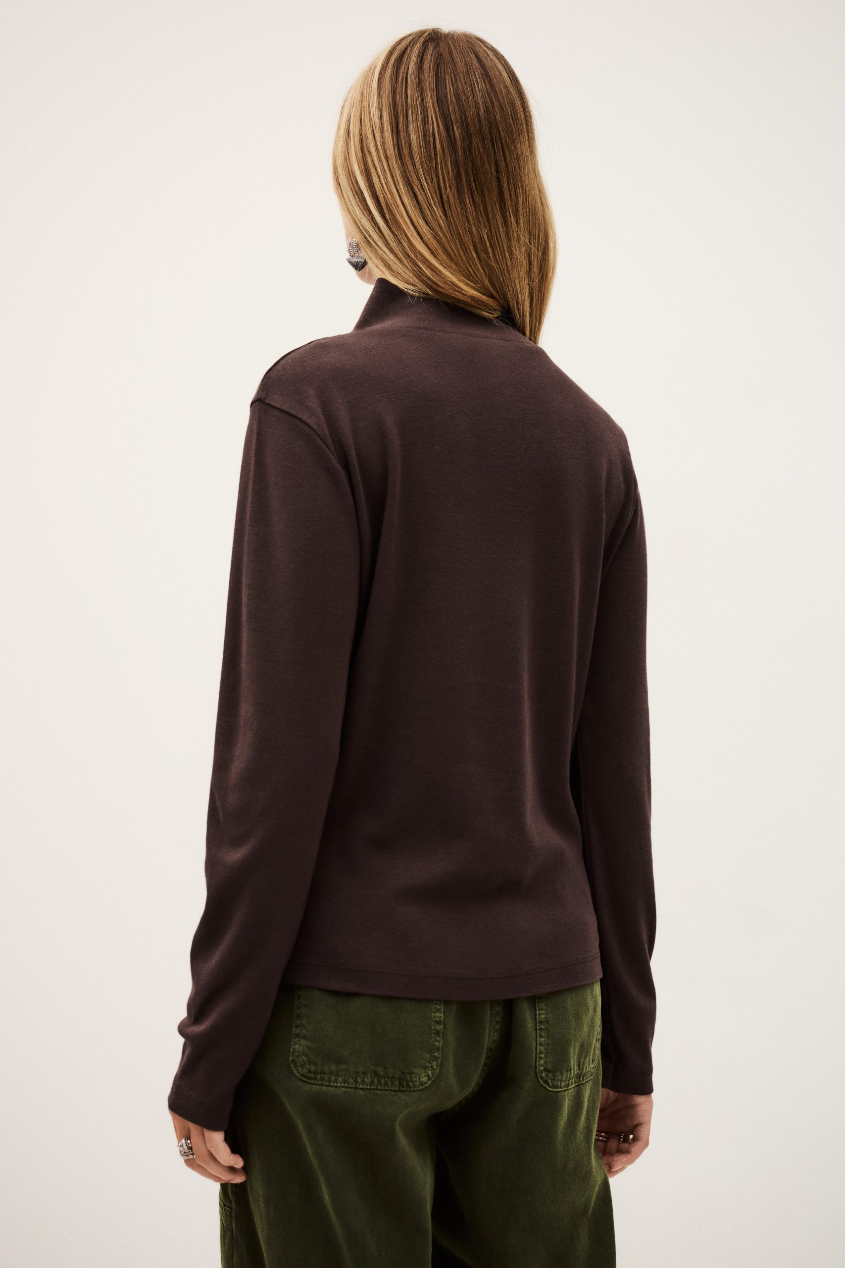 – Straight cut- Snug-fitting- Soft material- Long sleeves- Cross-over stand-up collarThe cotton fibers in this model come from organic farming.
