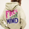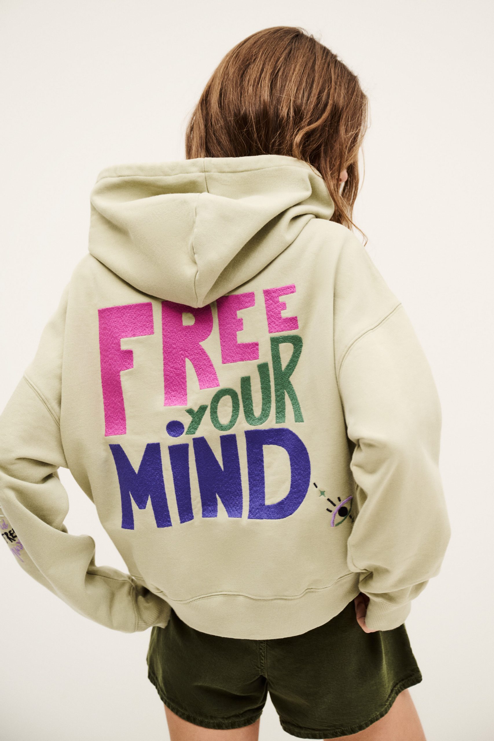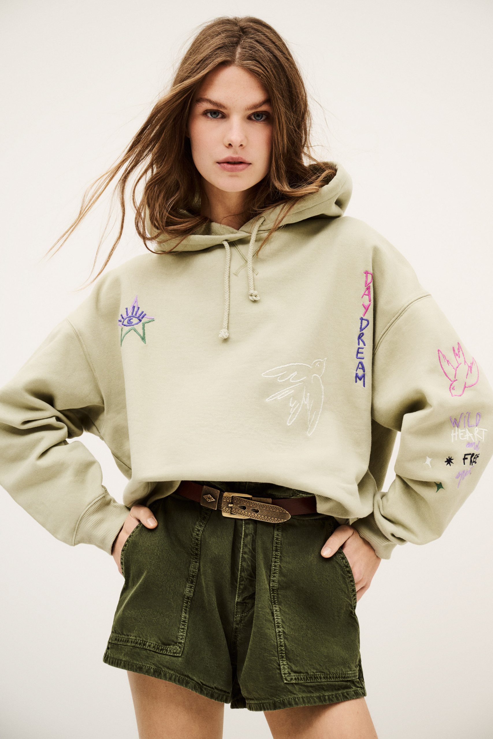 – Wide silhouette- Short length- Hooded – Drawstrings- Printed back and front- Ribbed edge