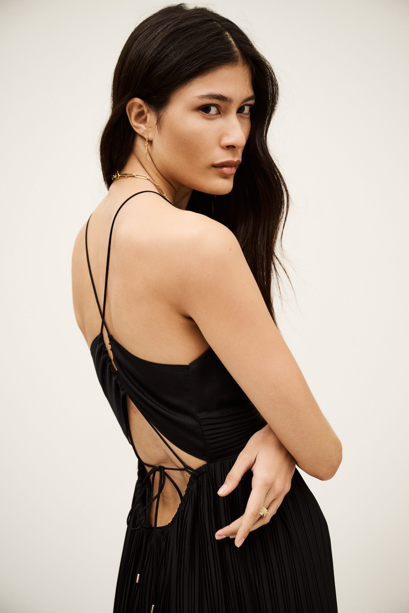 You’re going to fall head over heels for this long WASTA dress. Inspired by our WAXA dress, it is made unique by its gorgeous pleats. WASTA is extremely glamorous, as can be seen by its low-cut V-neckline and ring beneath the chest. Its thin straps lace up in back for an incredibly sensual look. We love the elastic waistband, which provides for maximum comfort and hold. Pair this dress with some sandals. This item is made with recycled fibers. – Long dress- Elastic waist
